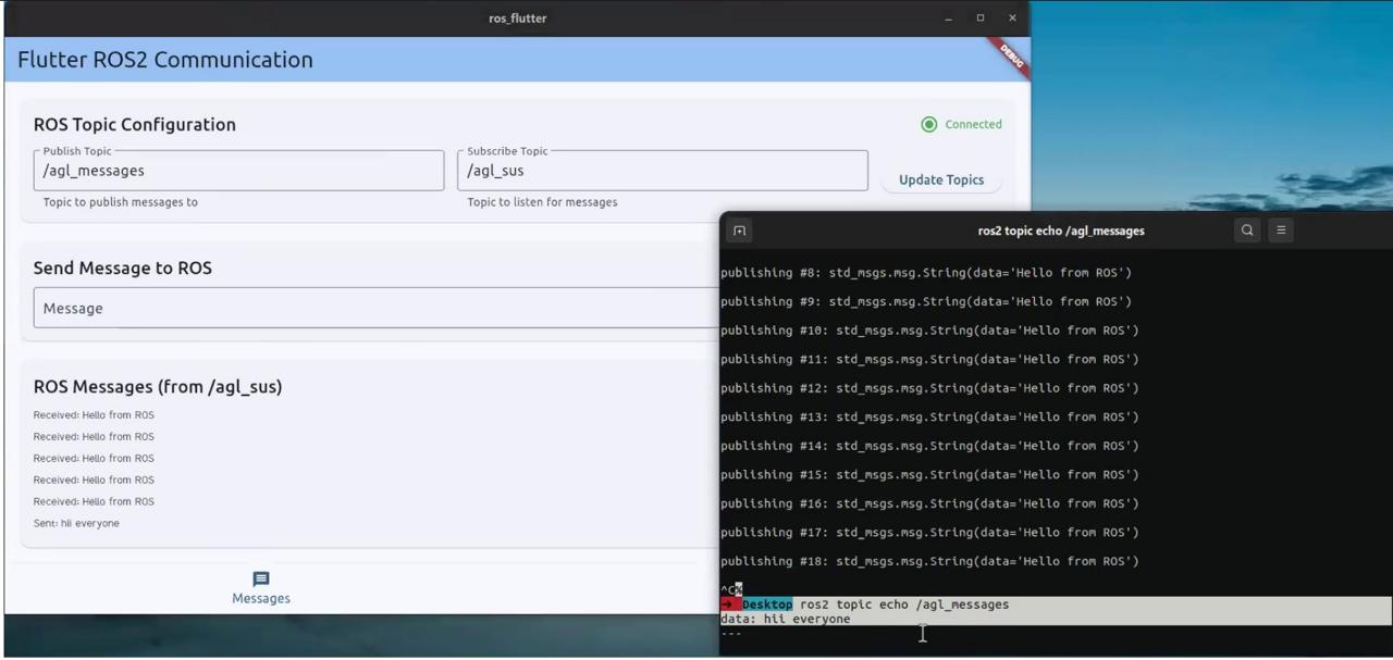 To interface the application with ROS, we evaluated two Flutter libraries: ros-bridge and rcldart. We chose rcldart because it is more recent and actively developed. After contacting the maintainer, we received permission to use it. Communication between ROS and Flutter worked on my development system, but initially failed on hardware due to user-namespace differences. AGL applications run under a separate user, but after resolving this, we successfully tested custom publishers and subscribers on the device.